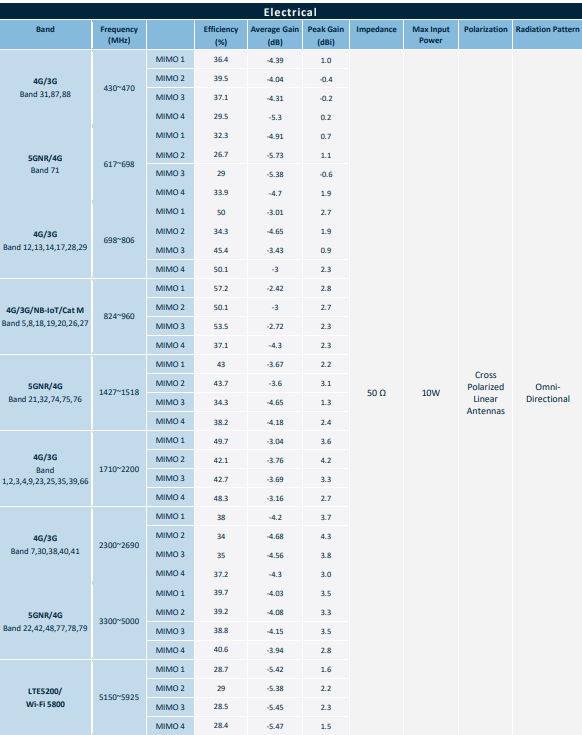 • 5G high band & CBRS up to 6 GHz - Omnidirectional gain pattern – captures signal from all directions