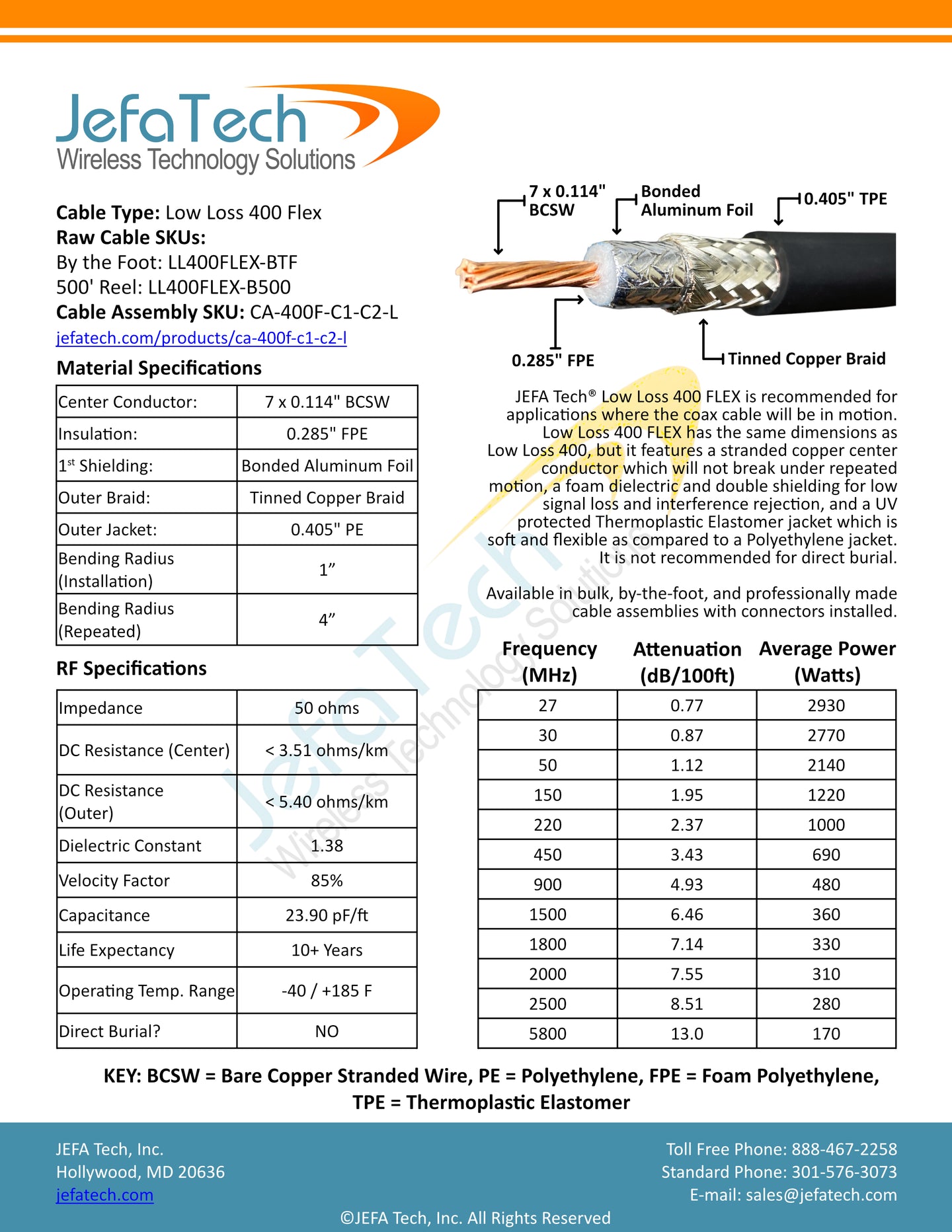 JEFA Tech® Low Loss 400 FLEX is recommended for applications where the coax cable will be in motion, for example, beam antennas that are on a rotator, short patch cables to go from your patch panel to radio equipment, or mobile applications such as land vehicles, boats and ships. Low Loss 400 FLEX has the same dimensions as Low Loss 400, but it features a stranded copper center conductor which will not break under repeated motion, a foam dielectric and double shielding for low signal loss and interference rejection, and a UV protected Thermoplastic Elastomer Jacket which is soft and flexible as compared to a Polyethylene Jacket. It is not recommended for direct burial.